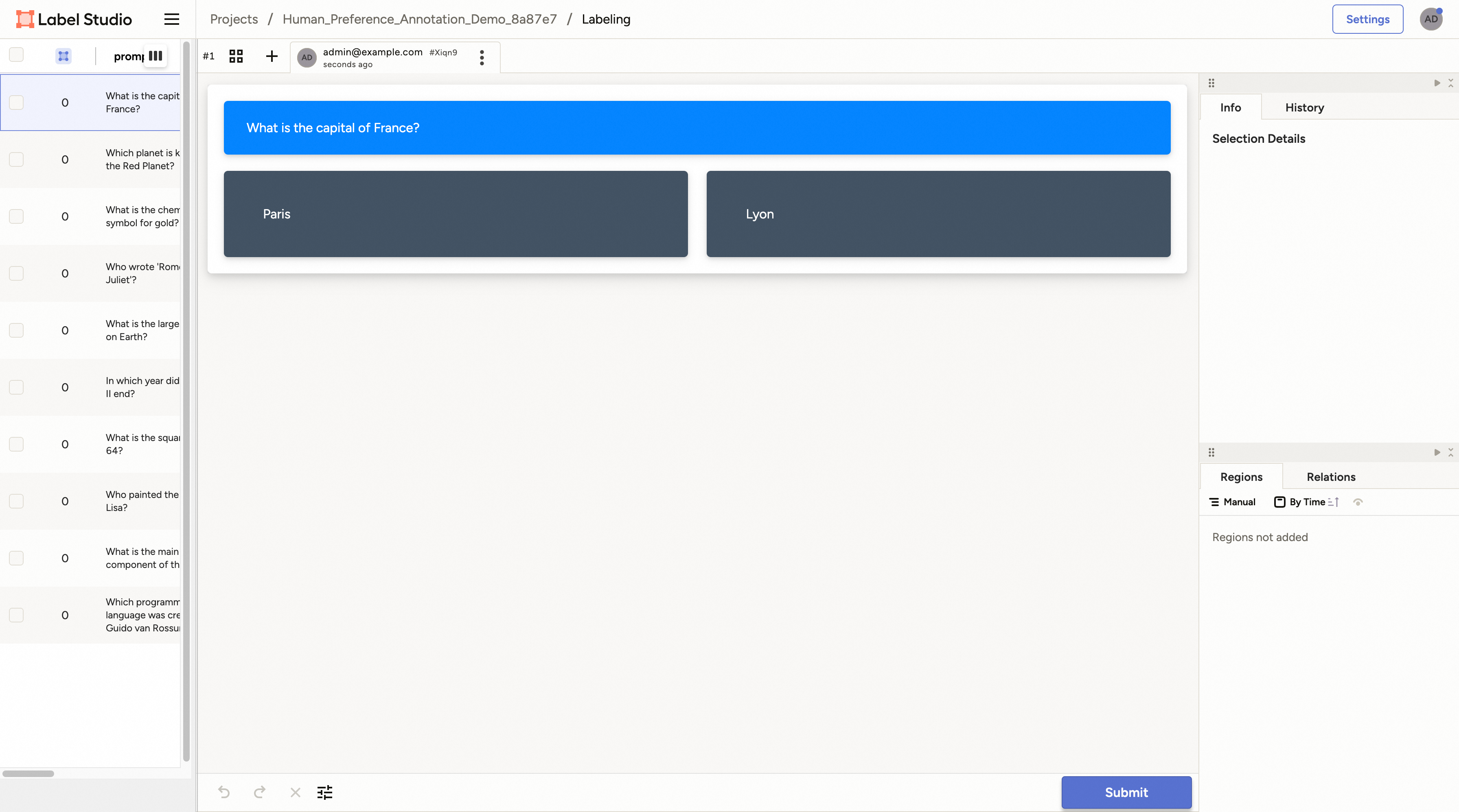 有时你可能需要对原始数据引入人工反馈。本示例将介绍如何标注原始数据,以在训练前获得更高质量的数据集。本示例使用一个示例问答数据集,尝试为 DPO 方法选择“chosen”和“rejected”的回复。
