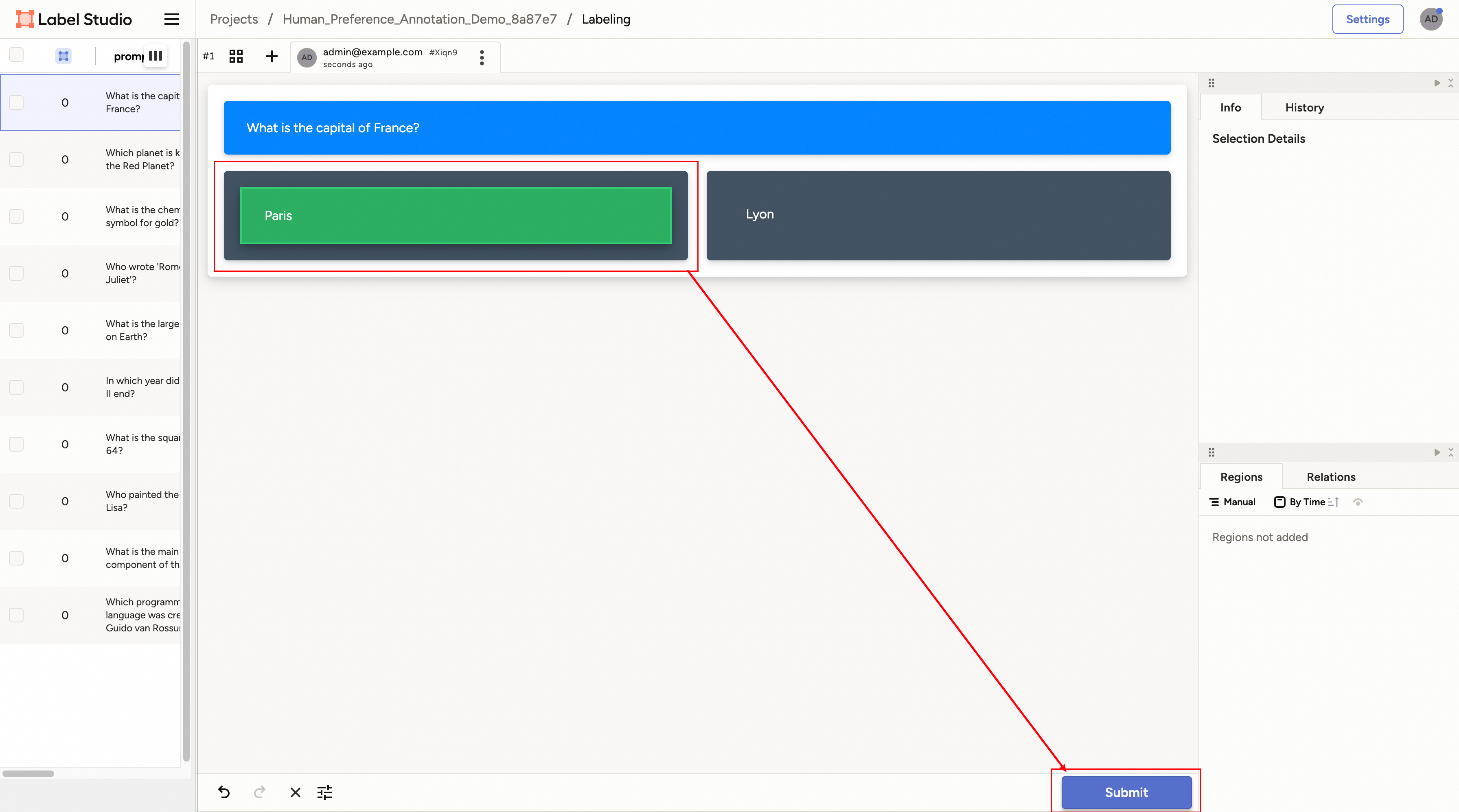 对于偏好标注场景,你可以选择更倾向/合适/正确的回答,然后点击“Submit”按钮提交标注结果。之后可继续选择其他样本重复此过程。