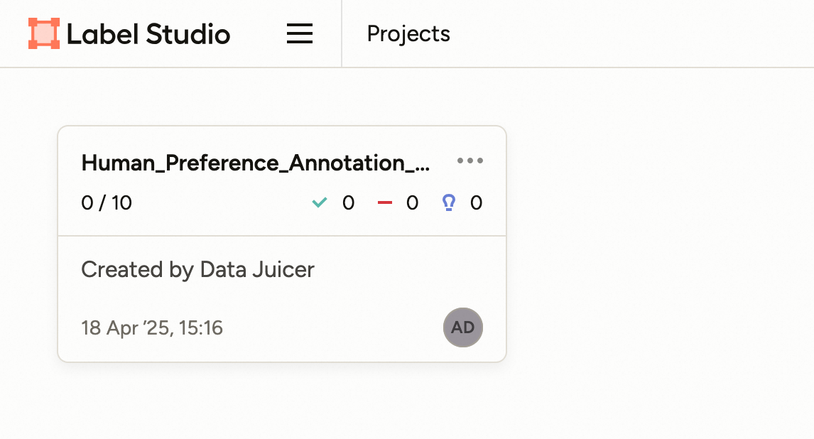 当你使用 RFT 配置启动运行时,数据处理器将启动 human_preference_annotation_mapper 算子,随后你可在 label-studio 服务的“Projects”页面看到一个新项目。