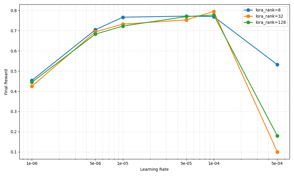 Final reward peaks near1e-4(and is already strong at5e-5) across ranks. This range is a practical “sweet spot” for stable learning + good performance.Too large LR (